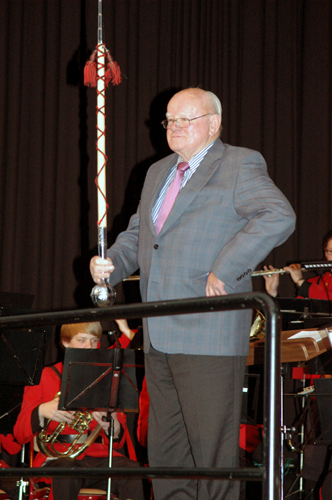 Gleich zu Beginn seiner Moderation bemängelte Davids die zu kleine Bühne, denn beide Musikzüge eröffneten das unterhaltsame Musikprogramm gemeinsam. Und für die über 60 Musiker des großen Klangkörpers war das Podium schon ziemlich eng. Ein erster Höhepunkt des Abends, an dem die Musiker ihr umfangreiches Repertoire präsentierten, war der Auftritt von Peppi Specht als Tambourmajor beim Marsch „Unser Peppi Marsch“, den Christof Niehoff, musikalischer Leiter der Brass Band, für den Ehrenvorsitzenden und Mitbegründer des Fanfarenzuges geschrieben hatte. Auch ohne Notenblatt und mit dem Rücken zum Orchester brachte es der Ehrenvorsitzende fertig, dass die Musiker dem Dirigenten brav folgten.